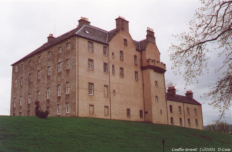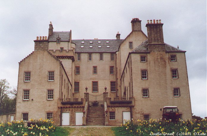 These are a selection of pictures of Castle Grant, the ancestral seat of the chiefs of Clan Grant in the heart of Grant country in Strathspey. The castle sits about 1.5 miles north of Grantown-On-Spey. These are pictures from both the outside and interior shots, some of which show the restoration work going on in the castle. (These photographs were take by the old Webmaster & his wife, or by various members of Clan Grant, except where noted).